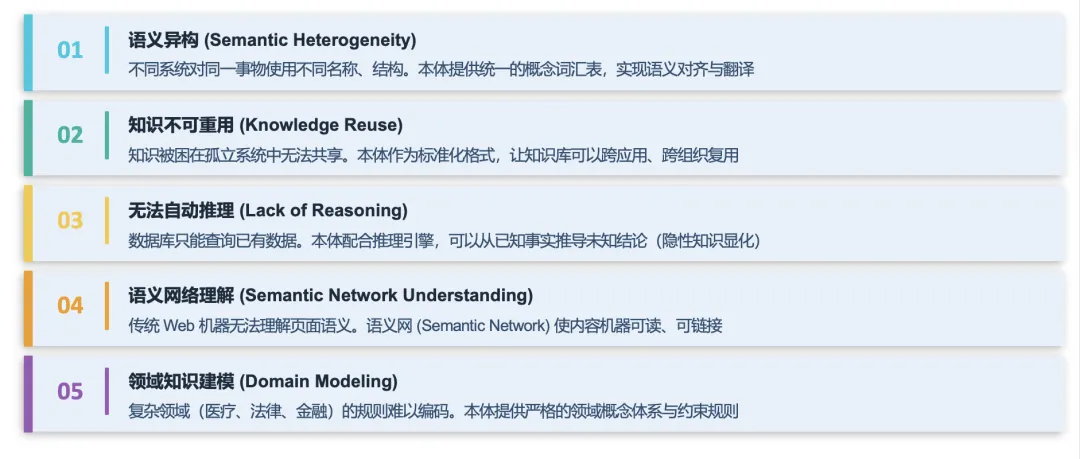 本体论可以为语义异构、知识不可复用、无法自动推理、语义网络理解、领域知识建模等问题提供解决思路,在 AI 时代,其核心价值可概括为以下两点: