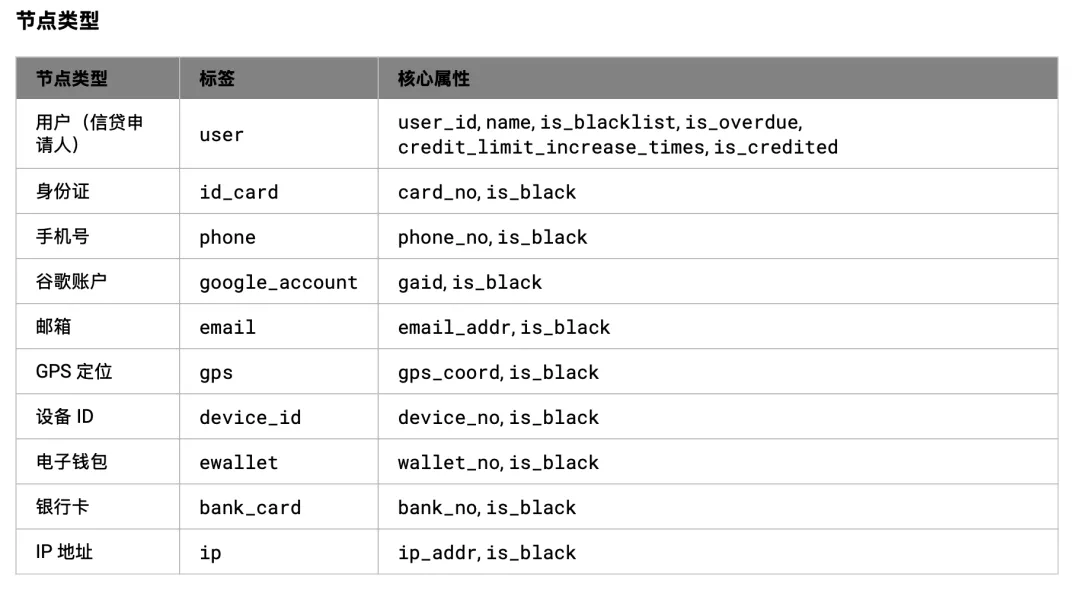 NODE TYPE `user` (LABEL `user`{`user_id` STRING NOT NULL, `name` STRING DEFAULT NULL, `is_blacklist` BOOL DEFAULT NULL, `is_overdue` BOOL DEFAULT NULL, `credit_limit_increase_times` INT64 DEFAULT NULL, `is_credited` BOOL DEFAULT NULL, PRIMARY KEY (`user_id`)}),